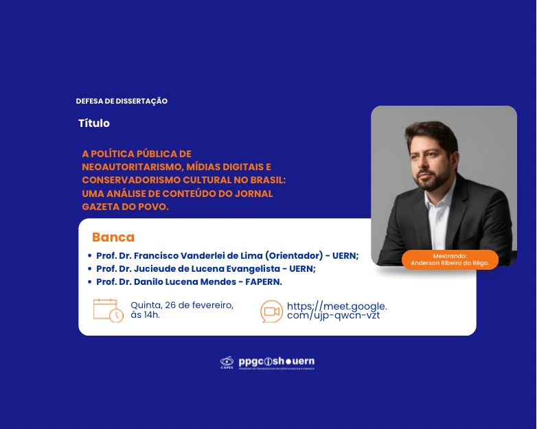 Defesa de Dissertação no PPGCISH/UERN! O Programa de Pós-Graduação em Ciências Sociais e Humanas (PPGCISH) convida a comunidade acadêmica para a defesa de dissertação. Título: A política pública de neoautoritarismo, mídias digitais e conservadorismo cultural no Brasil: uma análise de conteúdo do jornal Gazeta do Povo. Mestrando: Anderson Ribeiro do Rêgo. Banca: * Prof. Dr. Francisco Vanderlei de Lima (Orientador) – UERN; * Prof. Dr. Jucieude de Lucena Evangelista – UERN; * Prof. Dr. Danilo Lucena Mendes – FAPERN. Data: Quinta, 26 de fevereiro Horário: 14h Link da sala: https://meet.google.com/ujp-qwcn-vzt #capes #uern #ppgcish #dissertacao