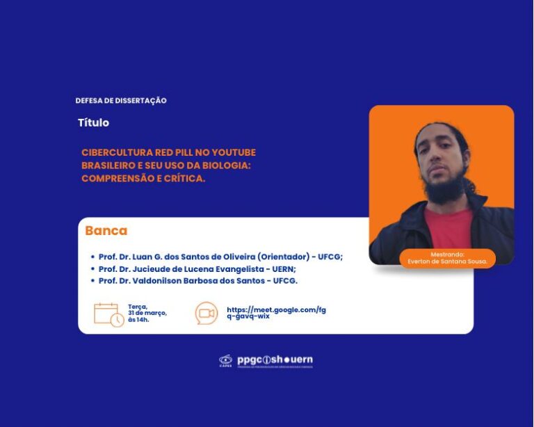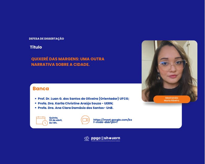 Defesa de Dissertação no PPGCISH/UERN! A mestranda Maria Ribeiro apresenta sua pesquisa que propõe novos olhares sobre a cidade a partir das margens. Título: Quixeré das margens: uma outra narrativa sobre a cidade. Banca: * Prof. Dr. Luan G. dos Santos de Oliveira (Orientador) – UFCG * Profa. Dra. Karlla Christine Araújo Souza – UERN * Profa. Dra. Ana Clara Damásio dos Santos – UnB Data: Quinta, 02 de abril Horário: 14h Acesse: https://meet.google.com/kof-mida-dbb?pli=1