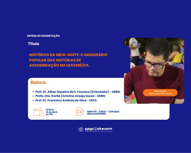 Defesa de Dissertação no PPGCISH/UERN! O Programa de Pós-Graduação em Ciências Sociais e Humanas (PPGCISH) convida a comunidade acadêmica para a defesa de dissertação. Título: Mistérios da meia-noite: o imaginário popular das histórias de assombração em Quixeré/CE. Mestrando: José Lucas Brito Souza. Banca: * Prof. Dr. Ailton Siqueira de S. Fonseca (Orientador) – UERN; * Profa. Dra. Karlla Christine Araújo Souza – UERN; * Prof. Dr. Francisco Antônio da Silva – UECE. Data: Quinta-feira, 16 de abril Horário: 10h Local: Sala G3 – FAFIC – Campus Mossoró/UERN. #capes #uern #ppgcish #dissertacao