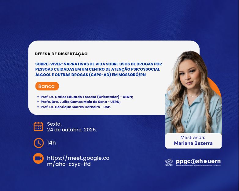 Defesa de Dissertação no PPGCISH/UERN! O Programa de Pós-Graduação em Ciências Sociais e Humanas (PPGCISH) convida a comunidade acadêmica para prestigiar a defesa de dissertação. Tema: Sobre-viver: Narrativas de vida sobre usos de drogas por pessoas cuidadas em um Centro de Atenção Psicossocial Álcool e Outras Drogas (CAPS-AD) em Mossoró/RN. Mestranda: Mariana Bezerra. Banca: Prof. […]